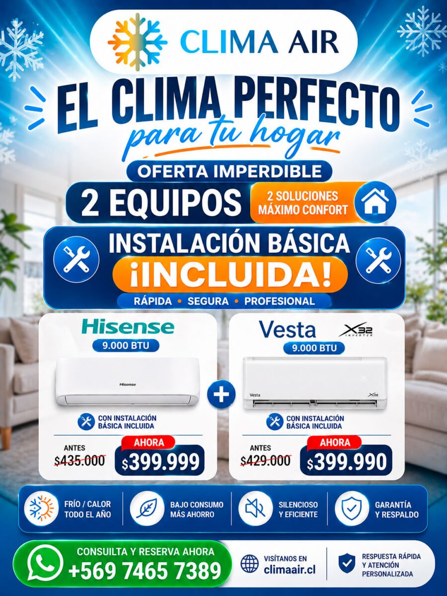 En ClimaAir, llevamos más de 21 años ofreciendo soluciones en climatización con la mejor relación calidad-precio del mercado. Desde nuestra fundación en 1998, nos hemos comprometido a brindar un servicio profesional, eficiente y adaptado a las necesidades de cada cliente. Ofrecemos una amplia variedad de marcas y capacidades para cubrir cualquier necesidad, siempre con precios competitivos y la instalación básica incluida en el valor del equipo. Nuestro equipo de expertos garantiza instalaciones seguras y de alto rendimiento, asegurando confort y eficiencia energética en cada proyecto. Llámanos y consulta por tu oferta.